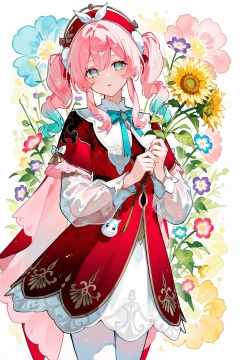 (tarou_minoboshi_style:1.3),(harukawa_sango_style:1.1),(kazuya_nakai_style:1),(yoshiki_ushida_style:1.1),(kana_asumi_style:1.1),masterpiece,best quality,good quality,very aesthetic,absurdres,newest,1girl,solo,looking_at_viewer,blush,flower,cowboy_shot,parted_lips,parted_bangs,see-through,own_hands_together,red_flower,pink_flower,blue_flower,yellow_flower,purple_flower,sunflower,see-through_sleeves,orange_flower,colorful,daisy,holding,Watercolor,<lora:ponyv5_noobV065S_1_adamW-000013:0.25>,<lora:USNR_STYLE_XL_lokr:0.45>,<lora:ILwatercolor:0.25>,<lora:96YOTTEA-WAI:0.45>,<lora:fenjin-ill-Tanger-000014:0.8>,hyacine \(honkai: star rail\),clothes: hyacine def red and white dress,red beret,1girl,pink hair,black footwear,white pantyhose,