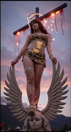 best quality, masterpiece, ultra high res, (photorealistic:1.4), raw photo, apocalyptic low angle, 18-year-old girl in shattered halo armor with bullet-casing garter belts ejecting spent cartridges, glowing scripture text tattoos on battle-torn stockings revealing bullet hole stigmata, standing on decapitated angel statue under inverted crucifix sky bleeding crimson light, LED shoes crushing broken wings emitting sparks from feather actuators