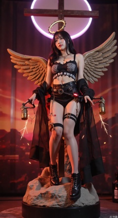 best quality, masterpiece, ultra high res, (photorealistic:1.4), raw photo, apocalyptic low angle, 18-year-old girl in shattered halo armor with bullet-casing garter belts ejecting spent cartridges, glowing scripture text tattoos on battle-torn stockings revealing bullet hole stigmata, standing on decapitated angel statue under inverted crucifix sky bleeding crimson light, LED shoes crushing broken wings emitting sparks from feather actuators