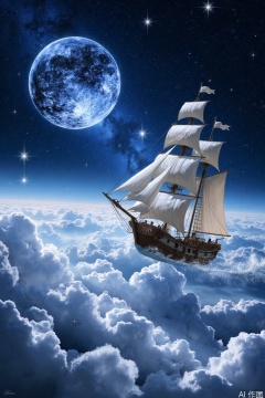 magic flying explorer approaching the pleiades aboard a magical sailboat in the sky,mist fog,gravity-defying,aloft flight,night sky,cosmic,