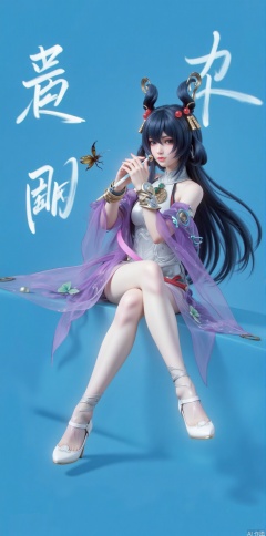 1girl, solo, long hair, looking at viewer, black hair, hair ornament, thighhighs, dress, sitting, closed mouth, full body, teeth, high heels,, bug, butterfly, purple dress, chinese text,jinghongzy,lolita,blue background,Solid color background,jujingyi