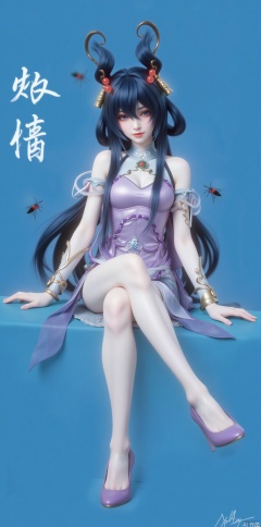 1girl, solo, long hair, looking at viewer, black hair, hair ornament, thighhighs, dress, sitting, closed mouth, full body, teeth, high heels,, bug, butterfly, purple dress, chinese text,jinghongzy,lolita,blue background,Solid color background,jujingyi