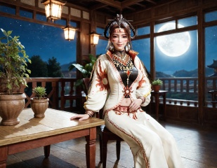 professional 3d model (score_9:1.2), (score_8_up), score_7_up,(((photorealistic))), 4k, sharp and focus,detailed shadows, detailed lighting, detailed background, detailed face, detailed body,<lora:syqiangk_徐T真_第一套_cl80vae:0.8>,xutianzhen_fz1, solo, jewelry, brown hair, necklace, braid, smile, brown eyes, earrings, hair ornament, facepaint, long hair,pants, midriff, navel, jacket, headdress, skinny thighs, long legs,breasts, (medium breasts), cleavage, cleavage cutout,extremely detailed, girl, bimbo, (lustful), (loving look), horny expression,(shiny skin:1.2), (wet), (pale skin:1.9), (fair skin:1.9), (white skin:1.6).(up close:1.2),(indoors, east asian architecture, full moon, moon, night, moonlight, night sky, sky, potted plant, plant, table, chair),The background features a wooden structure and east asian architecture, possibly a indoors or balcony, with a potted plant and a wooden table. The night sky is clear, with stars visible, and the full moon casts a soft glow, adding a mystical ambiance to the scene.The overall style is hyper-realistic, with attention to fine details such as skin texture, clothing folds, and lighting effects, creating a vivid and immersive visual experience.cowboy shot, (medium shot). sitting, looking at viewer . octane render, highly detailed, volumetric, dramatic lighting