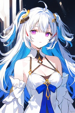 1girl, solo, long hair, breasts, looking at viewer, bangs, hair ornament, dress, cleavage, bare shoulders, medium breasts, blue hair, purple eyes, collarbone, upper body, ahoge, white hair, multicolored hair, parted lips, detached sleeves, white dress, two-tone hair, two side up, colored inner hair