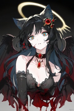 1girl, solo, long hair, breasts, looking at viewer, bangs, black hair, hair ornament, gloves, animal ears, cleavage, bare shoulders, jewelry, medium breasts, collarbone, upper body, multicolored hair, earrings, parted lips, wings, sleeveless, choker, black gloves, elbow gloves, cat ears, animal ear fluff, head tilt, blood, black choker, halo, slit pupils, blood on face, multicolored eyes, red gemstone