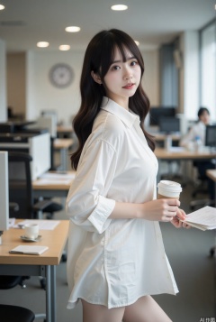 An Asian woman’s pure charm is captured in an everyday office setting. Her makeup is light, with a natural glow and a touch of soft pink blush. Her hair is a dark brown, styled in loose waves that fall over her shoulders. She wears a white shirt with a slightly oversized fit, giving a relaxed vibe. The office is bustling, with a desk, a chair, and a printer in the background. She stands beside the printer, holding a coffee cup in one hand and a document in the other, looking thoughtful. The camera captures her from a side angle, framing her from head to knees. Her expression is gentle and introspective. The lighting is cinematic, with soft shadows and a focus on her thighs and the texture of the shirt.