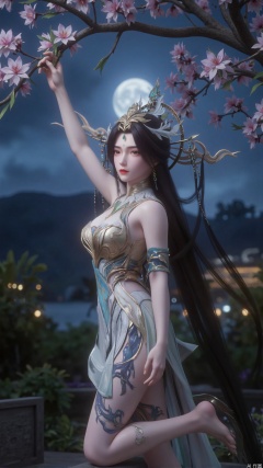Against the moonlit backdrop of the royal garden, a girl with long, straight black hair stood, one leg bent over her knee, the other out, as if ready to jump. She wore a modern qipao, a high-necked crop top and a short, flowing skirt that accentuated her thighs. The dragon tattoo on her thigh glistens in the moonlight, and as she reaches out to pluck a flower from a cherry tree, her gesture blends serene grace with subtle power.