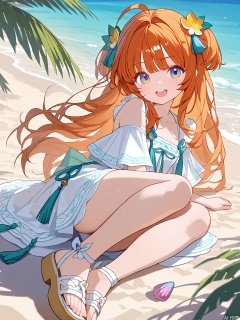MBFG, a young girl, featured wavy, caramel-colored hair decorated with colorful beach shells, shimmering turquoise eyes, and a carefree laugh. She wore a breezy white kaftan with tassel details and sandals on her feet. The scene was tropical, a sandy beach with palm trees swaying in the breeze.