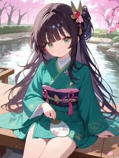 MBFG, a young girl, had long, flowing raven hair embellished with delicate cherry blossoms, emerald green eyes, and a serene gaze. She wore a traditional kimono with intricate patterns and a fan in her hand. The setting was serene, a Japanese garden with a koi pond.