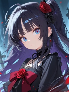 MBFG, a young girl, sported straight, raven-black hair decorated with crimson roses, piercing blue eyes, and a mysterious aura. She wore a gothic-inspired black dress with lace and velvet accents. The setting was eerie, a moonlit graveyard with fog rolling in.