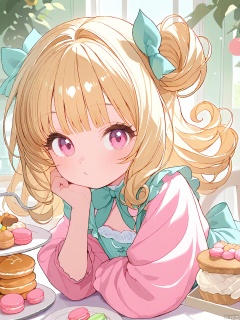 MBFG, a young girl, featured curly, honey-blonde hair decorated with pastel macarons, soft pink eyes, and a sweet demeanor. She wore a delightful pastel-colored dress with a matching bow in her hair. The surroundings were whimsical, a bakery filled with delicious treats and pastries.