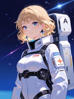 LCCH, A digital rendering of two astronauts, preparing for a space mission. One has wavy blond hair and the other short brown, both with determined blue eyes. The background is the vast expanse of space with distant stars and planets.