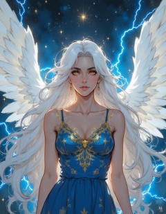 A digital illustration shoot from a frontal camera angle about an angel with long white hair and large white wings, standing in the middle of the image, wearing a blue and gold dress with a plunging neckline and intricate patterns. the angel appears to be looking directly at the viewer with a serene expression, her golden eyes gleaming with a soft glow. her long, flowing white hair cascades down her back, framing her face and accentuating her delicate features. the background is a dark, starry night sky filled with bright, glowing lightning effects, adding to the ethereal atmosphere of the scene. the woman's dress is sleeveless, revealing her bare shoulders and medium-sized breasts, and she is wearing earrings, adding a touch of elegance to her overall appearance.,<lora:手工绘画风(1):1>,