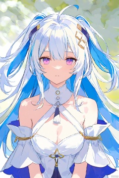 1girl, solo, long hair, breasts, looking at viewer, bangs, hair ornament, dress, cleavage, bare shoulders, medium breasts, blue hair, purple eyes, collarbone, upper body, ahoge, white hair, multicolored hair, parted lips, detached sleeves, white dress, two-tone hair, two side up, colored inner hair