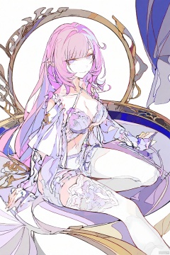 A serene watercolor-inspired illustration of Elysia from Honkai Impact, posed solo in a bedroom setting. Soft light casts gentle shadows on her porcelain skin, highlighting the transparent frills and delicate lace bra. Her long hair cascades down her back, as she gazes directly at the viewer with an alluring expression. The white background serves as a subtle contrast to her radiant, shiny skin. The trough-shaped bedframe and candelabras add ornate details, while the rhasta-inspired patterns on her clothing hint at her adventurous spirit. This masterpiece is rendered in high-definition, showcasing Elysia's sensitive beauty with exquisite precision.