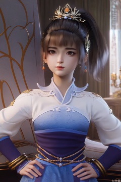 1girl, solo, bangs, brown hair, black hair, hair ornament, long sleeves, dress, brown eyes, jewelry, ponytail, earrings, indoors, bracelet, blue dress, tiara, hands on hips, realistic