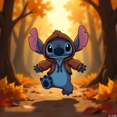 disney_stitch in a furry hoodie jumping through autumn leaves, cozy forest path, golden hour lighting