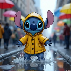 disney_stitch dressed in yellow raincoat splashing puddles, urban street with colorful umbrellas, soft rain particles