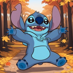 disney_stitch in a furry hoodie jumping through autumn leaves, cozy forest path, golden hour lighting