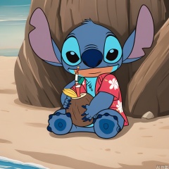 disney_stitch wearing a hawaiian shirt, sitting on a sandy beach with coconut trees, holding seashells, soft daylight