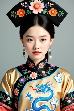 The girl in the picture is wearing Qing Dynasty checkered clothing. The main body of the flag is beige