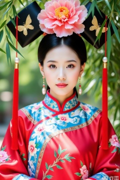 A full body portrait of a Qing Dynasty woman,dressed in bright red satin Qing Dynasty clothing,with embroidered gold thread peony branches on the collar and cuffs,and decorated with river cliff and sea water patterns on the hem. Wearing a black painted emerald flag on the head,with a pink silk peony (diameter 18cm) decorated in the center,and gilded butterfly temples and pearl tassels on both sides. The character stands against the bamboo,with a blurred green bamboo forest in the background. Sunlight shines through the bamboo leaves,creating a light spot that illuminates the embroidery pattern. The fabric's three-dimensional texture is enhanced by backlighting,