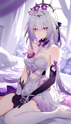 xiadie,a girl named xiadie,1girl,solo,bare shoulders,white dress,black gloves,purple gloves,elbow gloves,purple flower,white thighhighs,<lora:瑕蝶2noob:1>,indoors,bedroom,wariza,(16-year-old girl:1.3),honkai: star rail,year 2024,(sheya:0.2),(ooo_wange:1),(wlop:0.0),very awa,very as2,best quality,masterpiece,best quality,absurdres,highres,newest,