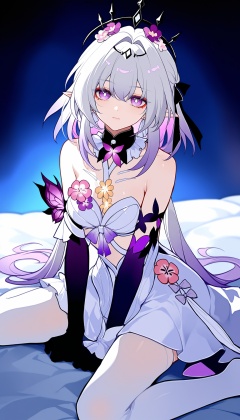 xiadie,a girl named xiadie,1girl,solo,bare shoulders,white dress,black gloves,purple gloves,elbow gloves,purple flower,white thighhighs,<lora:瑕蝶2noob:1>,indoors,bedroom,wariza,expressionless,light smile,honkai: star rail,year 2024,(sheya:0.2),(ooo_wange:1),(wlop:0.0),very awa,very as2,best quality,masterpiece,best quality,absurdres,highres,newest,