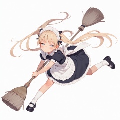 masterpiece,best quality,amazing quality,simple background,white background,(1girl,solo, loli),(very long twintails, blonde hair, ),blue eyes,half-closed eyes,blush,face,smile,maid,maid apron,long maid headdress,white socks,black footwear,looking at viewer,dynamic pose,holding broom,cleaning,<lora:MUK_style_v1:0.7>,