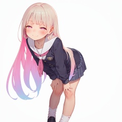 masterpiece,best quality,amazing quality,simple background,white background,1girl,solo,loli,(very long hair, colorful hair, ),pink eyes,(half-closed eyes, smile, ),blush,school uniform,white socks,black footwear,looking at viewer,standing, leaning forward, <lora:MUK_style_v1:0.7>,
