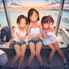 masterpiece,best quality,amazing quality,heart hands, multiple girls, smile, closed eyes, shorts, 3girls, heart, bag, dress, bangs, sitting, hair ornament, black hair, sandals, grin, white dress, bow, hair bow, phone, long hair, outdoors, sleeveless, cellphone, short hair, short shorts, hairclip, blush, heart hands duo, shirt, closed mouth, tan, belt, blunt bangs, see-through, sunset, bare shoulders, cloud, watercraft, scrunchie, smartphone, backpack, sky, jewelry, boat, brown hair, tanlines, ocean, navel, blue shorts, parted bangs, ground vehicle, side ponytail, sleeveless dress, twintails, denim shorts, denim, ^_^, shoes, knees together feet apart, pink bow, collarbone, day, panties, white shirt, bracelet, midriff, underwear, bare legs, short sleeves, girl sandwich, open mouth, horizon, polka dot,<lora:MUK_style_v1:0.7>,