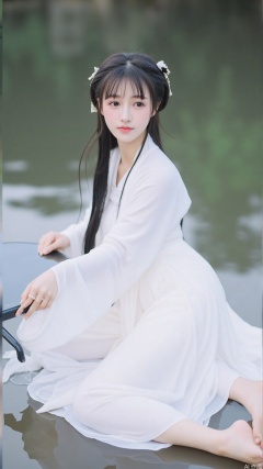 A girl with long black hair sitting by water, dressed in a white Hanfu, traditional Chinese attire, looking at the audience with a gentle expression. She wears long sleeves and plays a musical instrument, creating a serene and captivating scene. The background is blurred to focus attention on her graceful form and the tranquil waters. The lighting is soft, enhancing the delicate details of her clothing and the ethereal atmosphere.