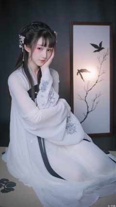 The background is a dark, muted palette, with a large, partially visible white paper screen featuring black silhouettes of birds and flowers, adding a sense of depth and elegance to the scene. The woman is seated on a cushioned surface, likely a traditional mat, which is covered with a white fabric adorned with subtle floral patterns. The overall atmosphere is serene and ethereal, with soft lighting that highlights her delicate features and the intricate details of her attire.