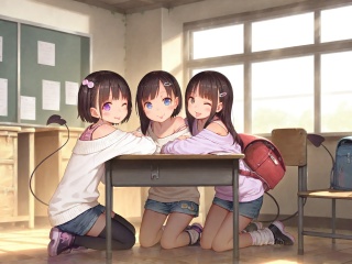 multiple girls,demon tail,sitting,long hair,indoors,thighhighs,open mouth,tail,3girls,short hair,one eye closed,backpack,brown hair,skirt,bag,smile,hair ornament,brown eyes,demon girl,long sleeves,shirt,off shoulder,window,shorts,shoes,randoseru,desk,socks,black hair,sweater,day,closed mouth,kneeling,hairclip,tongue out,sunlight,classroom,tongue,;d,black footwear,looking at viewer,purple eyes,blue eyes,chair,backpack removed,<lora:MUK_style_v1:0.7>,