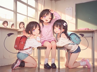 masterpiece,best quality,amazing quality,multiple girls,demon tail,sitting,long hair,indoors,thighhighs,open mouth,tail,3girls,short hair,one eye closed,backpack,brown hair,skirt,bag,smile,hair ornament,brown eyes,demon girl,long sleeves,shirt,off shoulder,window,shorts,shoes,randoseru,desk,socks,black hair,sweater,day,closed mouth,kneeling,hairclip,tongue out,sunlight,classroom,tongue,;d,black footwear,looking at viewer,purple eyes,blue eyes,chair,backpack removed,<lora:MUK_style_v1:0.7>,