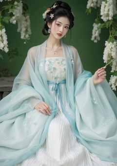 The image depicts a woman dressed in traditional East Asian attire, specifically a flowing, elegant gown with intricate embroidery. The gown is primarily light blue with floral patterns and a soft, translucent quality. She is adorned with delicate jewelry, including a necklace and earrings, and her hair is styled in an elaborate updo, embellished with flowers and decorative pins. The background features lush green foliage and cascading white blossoms, creating a serene and picturesque setting. The overall composition exudes a sense of grace and timeless beauty.