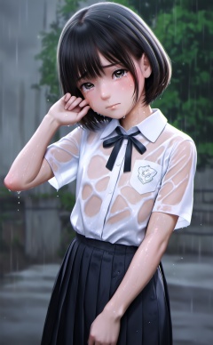 masterpiece,highres,newest,best quality,high quality,loli,petite,chromatic_aberration,//,,loli,1girl,solo,black hair,rain,shirt,looking at viewer,white shirt,skirt,short sleeves,short hair,black skirt,tears,ribbon,collared shirt,wet clothes,black ribbon,wet,neck ribbon,school uniform,breast pocket,crying,outdoors,pocket,upper body,closed mouth,blurry background,bob cut,blurry,crying with eyes open,pleated skirt,hand up,//,year_2023,year_2024,//,