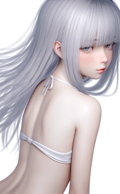 masterpiece,highres,newest,best quality,high quality,loli,petite,chromatic_aberration,//,1girl,white_skin,silver hair,straight_hair,blunt bangs,//,white_background,halter_top, tied_neck, exposed_back, minimalistic//,year_2023,year_2024,//,