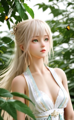 masterpiece,highres,newest,best quality,high quality,chromatic_aberration,//,3D,3d cg,1girl,solo,small_breasts,hanfu,long hair,green eyes,blonde hair,hair ornament,bare shoulders,hanfu,breasts,dress,chinese clothes,white hair,upper body,leaf,bug,cleavage,white dress,//,year_2023,year_2024,//,