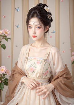 The picture shows a woman in classical and elegant style clothing. Her hair was carefully coiled up and she wore a hair accessories decorated with flowers. There was a delicate forehead ornament on her forehead. Her makeup is exhaust and her blue eyes are particularly charming. She wore a light-colored suspender dress with floral patterns, a light white tulle dress on her shoulders, and brown fabric over her shoulders. She held a folding fan with floral patterns in her elegant posture. There are soft gauze curtains in the background, with pink and white flowers dotted beside them, and a few blue butterflies flying, creating a classical and beautiful atmosphere.