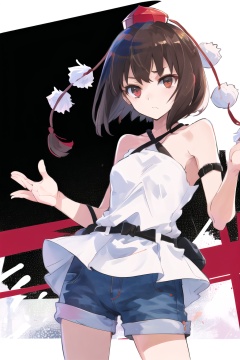 1girl,solo,front view,shameimaru aya,(tokin hat:1.1),(pom pom \(clothes\):1.1),red headwear,hat,criss-cross_halter,denim_shorts,red eyes,short hair,brown hair,<lora:shameimaru aya002-000012:0.65>,