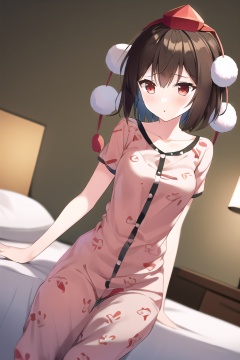 1girl,solo,shameimaru aya,tokin hat,pom pom \(clothes\),red headwear,hat,red eyes,short hair,brown hair,<lora:shameimaru aya002-000012:0.7>,nightgown,homewear,print_pajamas,dynamic_angle,bedroom,
