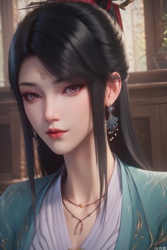 1girl, solo, looking at viewer,long hair, black hair, jewelry, closed mouth, upper body, earrings, necklace