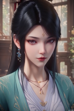 1girl, solo, looking at viewer,long hair, black hair, jewelry, closed mouth, upper body, earrings, necklace