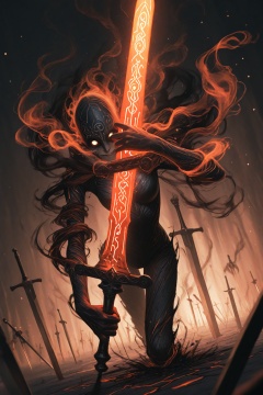 masterpiece,best quality,amazing quality,very aesthetic,absurdres,newest,extreme aesthetic,in the style of fashion photography,light particles,cinematic lighting,Visual impact,sharp focus,Emotionalization,depth of field,dutch angle,scenery,dynamic angle,unusual angle,dynamic,dynamic composition,single sword,runic engraving,runes,sould of the damned,broken sword,broken,damagedIn the dim,flickering light,a sinister shadowy figure emerges,its presence cloaked in an air of mystery. (Looking at the viewer with sinister smile:1.3) Slowly,it reaches out toward the hilt of the shattered runic sword,its movements deliberate yet hesitant. The ancient engravings on the hilt begin to pulse faintly,glowing like a dying ember,their light casting eerie shadows across the figure’s outstretched hand. The closer it gets,the air grows colder,heavy with an otherworldly presence. From the jagged break in the blade,spectral wisps begin to unfurl,curling and twisting like smoke,their forms coalescing into ghostly faces etched with agony. Whispers fill the air—soft at first,but rising into a cacophony of tormented wails. The figure’s hand trembles as its fingers hover just above the hilt,as though sensing the weight of the cursed power it is about to claim. Finally,with a sharp intake of breath,the hand closes around the sword. The runes ignite with a blinding light,and the escaping souls recoil,writhing in both fear and fury.,