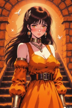 1girl, solo, long hair, breasts, looking at viewer, blush, bangs, brown hair, black hair, hair ornament, long sleeves, dress, cleavage, bare shoulders, jewelry, medium breasts, closed mouth, standing, earrings, detached sleeves, wings, choker, puffy sleeves, belt, necklace, lips, orange eyes, bird, stairs, orange dress, orange theme