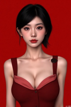 This is a woman with an Eastern face,This woman has short black hair, red lips, shoulderless suspenders, cleavage, big breasts,real person, red background