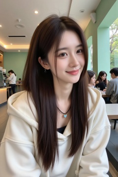 beauty,The image is a high-resolution photograph of a young Asian woman in her mid-20s, sitting at a table in a modern, well-lit cafe. She has long, straight, dark brown hair that falls past her shoulders. Her skin is fair with a smooth complexion, and she has a warm, inviting smile. She is wearing a white hoodie with the hood down, revealing a black top underneath. Around her neck, she has a black necklace with a heart-shaped pendant.Her makeup is subtle yet enhancing, with a focus on natural beauty. She has light eyeliner, mascara, and a soft pink lipstick. She is also wearing small, gold hoop earrings.In the background, the cafe has a sleek, contemporary design with a mix of light green and white walls. There is a counter with an espresso machine on the left side, and the back wall features large windows that let in natural light, revealing a view of greenery outside. The ceiling has a modern, arched design with recessed lighting. Other patrons are visible in the background, but the main focus remains on the woman. The overall atmosphere is casual and comfortable, with a modern, urban vibe.