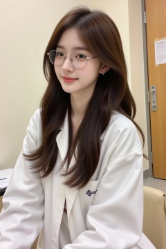beauty,The image is a high-resolution photograph featuring a young Asian woman with long, wavy brown hair cascading past her shoulders. She is wearing a white lab coat over a light-colored top, giving her a professional appearance. She has a slender physique and is wearing thin-framed, round glasses with small decorative details on the temples. Her skin is fair, and she has a gentle, welcoming smile on her face. She is seated, with her hands resting on her lap.The background suggests an indoor setting, possibly a laboratory or a medical facility. The walls are painted a light cream color, and there is a wooden door to the right side of the image, partially open, revealing a glimpse of a hallway beyond. The door is light brown with a metal handle and a small window near the top. There is a piece of paper taped to the wall behind her, though the content is not clear.The overall ambiance is clean and orderly, with a focus on functionality and professionalism. The lighting is bright and evenly distributed, highlighting the subject and the details of the setting. The photograph captures a moment of calm and focus, likely during a work or educational session.