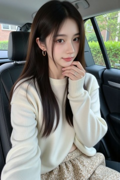 beauty,The image is a high-resolution photograph of a young Asian woman sitting in the back seat of a car. She has long, straight, dark brown hair that cascades past her shoulders, framing her delicate, oval face. Her skin is fair and smooth, with a natural glow. She has large, expressive brown eyes, arched eyebrows, and a slight smile with her lips slightly parted, revealing a hint of her teeth. Her facial features are well-defined, giving her a youthful and elegant appearance.She is wearing a white, ribbed, long-sleeved sweater that has a relaxed fit, and a beige, textured skirt with a floral pattern. Her outfit is casual yet stylish. She accessorizes with a pair of small, round, gold hoop earrings and a delicate silver ring on her right index finger. The car's interior is modern and luxurious, with dark leather seats and a sleek dashboard. The background outside the car window shows a blurred view of a garden with green foliage and a brick building, suggesting a suburban or urban setting. The overall mood of the photograph is calm and serene, with soft natural light enhancing the subject's features and the car's interior